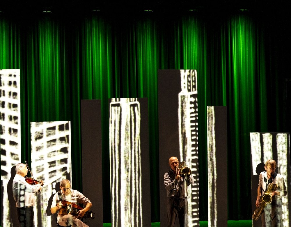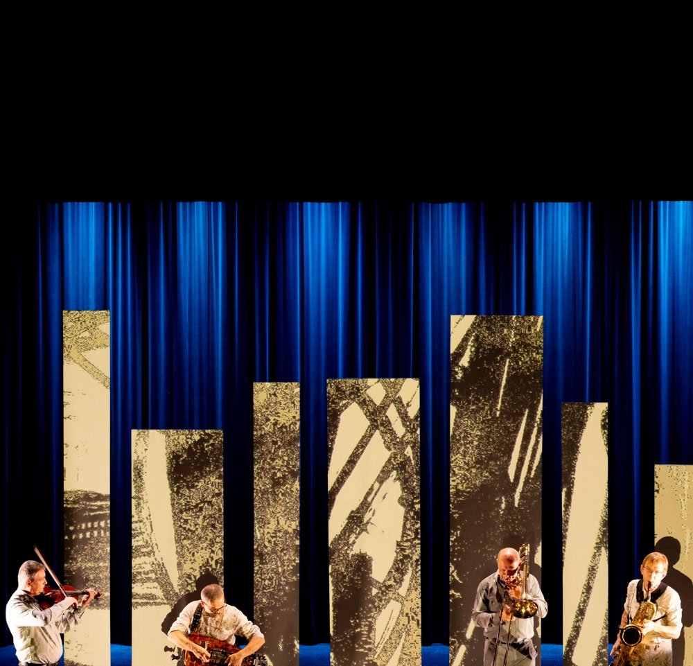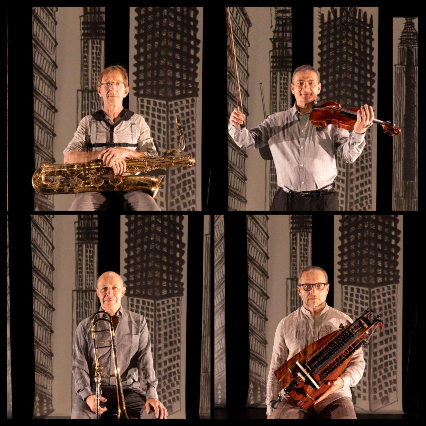 Avec un sax baryton, une vielle à roue, un trombone et un violon, l’Orchestre symphonique de poche crée une nouvelle musique traditionnelle imaginaire, entre jazz, classique, contemporain et autres surprises. Issu des musiques traditionnelles de Bretagne, l’insatiable Ronan Le Gouriérec — artiste associé à Mixt — forme un premier duo avec Iacob Maciuca, violoniste roumain, virtuose du style tsigane. De leur rencontre avec Jean-Louis Pommier et Romain Baudouin naît un quartet sans étiquette, pointu et populaire. Leur concert animé d’images filmées en direct est une ode au voyage, joyeuse, pétillante et communicative.