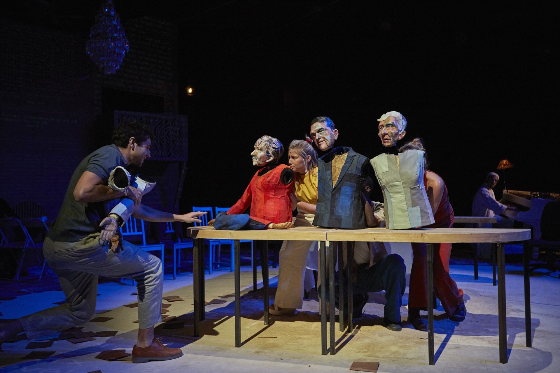 Un banquet, des bougies. Les Parques cuisinent tandis qu’un immense oiseau tisse les trois fils du récit : le dernier repas entre Zeus, Prométhée et les humains ; les retrouvailles d’amis franco-grecs naguère militants contre la politique d’austérité de 2008 ; et la table des négociations sur la dette publique de 2015 où se confrontent le gouvernement de Tsipras, le FMI, la Banque centrale et l’Union européenne. Dans l’univers artisanal des Anges au plafond, les marionnettes en papier mâché côtoient les interprètes et le public, pour mettre en partage un pan d’histoire grecque à ne pas oublier.